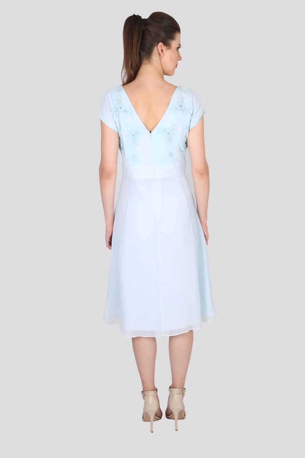Light aqua dress with floral motifs in organza ribbon and hand embroidered.