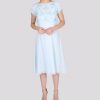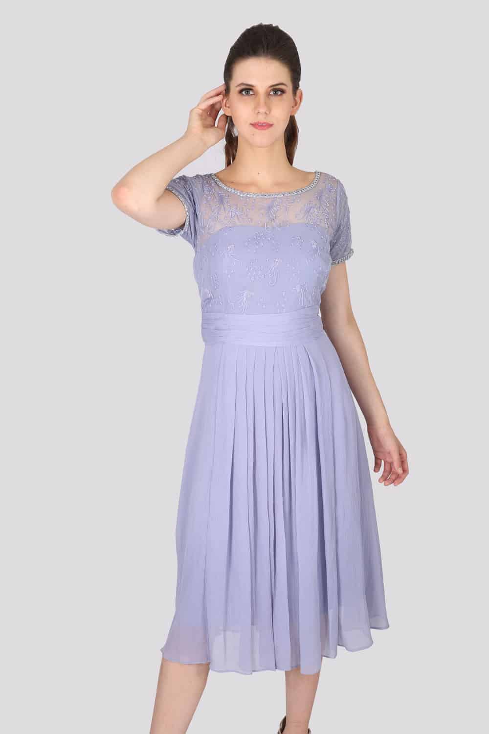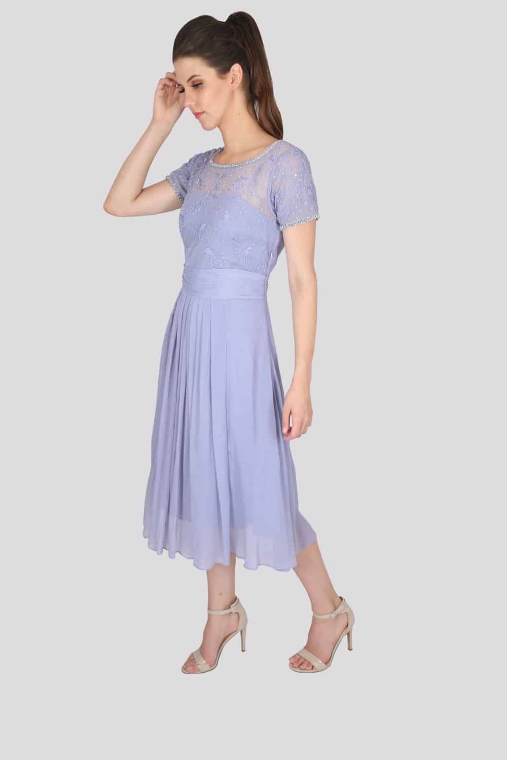 Powder blue chiffon dress with hand made lace overlay and silver ribbon details at the trims.