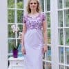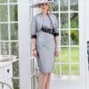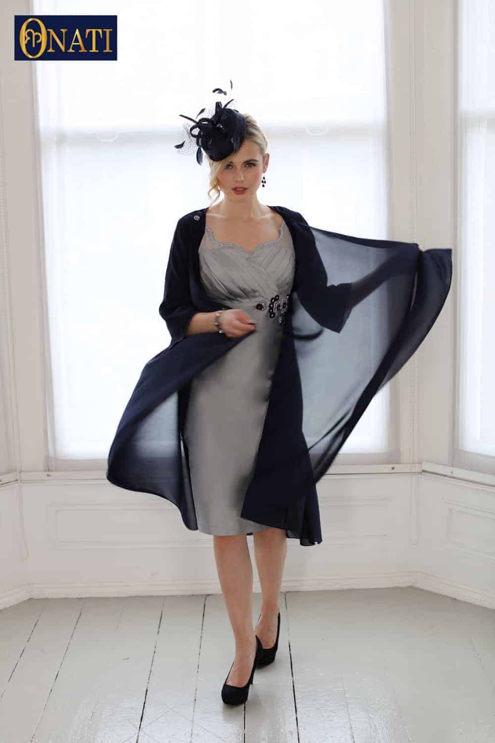 Grey and Navy Taffeta draped dress with intricate embroidery motifs at the waist. Ensemble with Bolero code ORTB005D.
