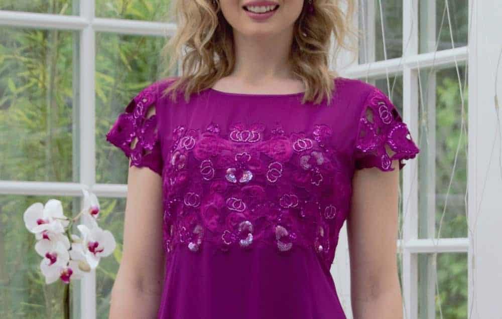 Crafted from a soft Georgette fabric, this piece envelopes the contours of the body for a silhouette-enhancing finish, whilst the delicate semi-sheer bodice and cap sleeves are adorned with pretty floral motif cut-work lace embellishment and finished with a beads & sequin for added decor.